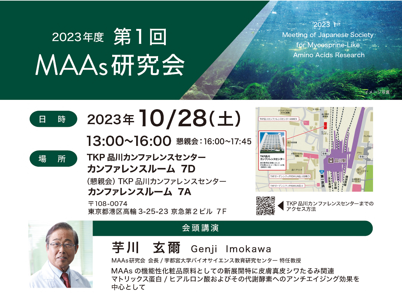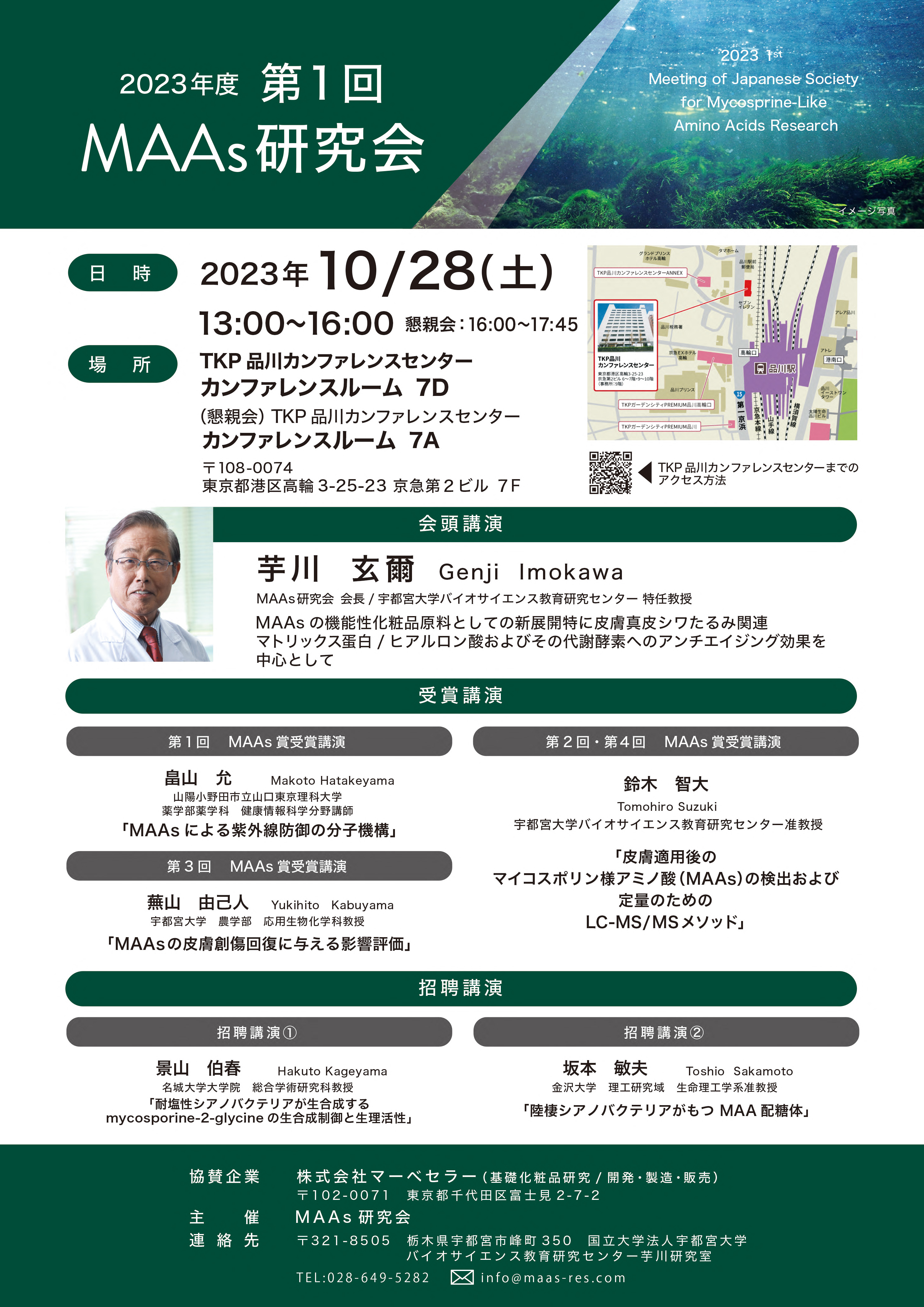 - 2021年2月12に国立大学法人宇都宮大学農学部応用生物化学科生物化学研究室・教授の蕪山由己人 氏が研究課題:MAAsの皮膚創傷回復に与える影響評価でMAAs研究会第3回MAAs賞50万円に選定されました。